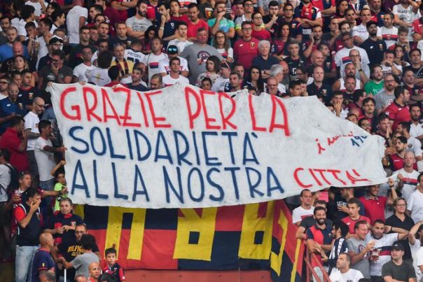 GENOVA – Si osserva un minuto di silenzio in memoria delle vittime del crollo del Ponte Morandi. Un silenzio assordante durato 43′ minuti quello dei tifosi del Genoa a Marassi durante la partita con l’Empoli per onorare le 43 vittime del crollo del ponte, un silenzio al quale si sono uniti anche i tifosi ospiti. Al 42′ sui maxischermi, mentre il gioco proseguiva, sono stati scanditi i nomi delle 43 vittime del crollo di Ponte Morandi accompagnati da un lunghissimo applauso di tutto lo stadio in piedi e allo scoccare del 43′ la gradinata Nord è esplosa in un unico coro Genova, Genova, calcando soprattutto la sillaba va come a voler ripartire dopo la tragedia che ha colpito la città. I tifosi in occasione delle due reti si sono limitati ad applaudire.