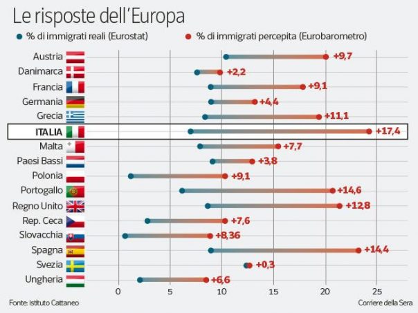 Gli italiani evidenziano uno scarto maggiore «tra la percentuale di immigrati realmente presenti nel Paese, pari al 7% e quella stimata o percepita, pari al 25%, si trovano anche nella posizione più estrema, nel rapporto tra le due variabili, caratterizzata dal maggior livello di ostilità verso l’immigrazione e le minoranze religiose.