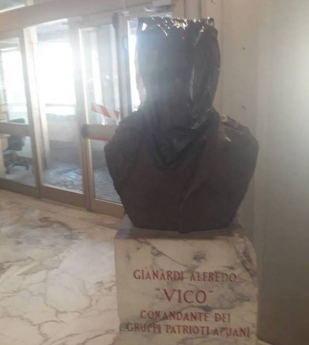 MASSA (MASSA CARRARA) – Il busto in marmo del comandante partigiano Alfredo Gianardi detto Vico, collocato nell’atrio del Comune di Massa (Massa Carrara) è stato ‘incappucciato’ stamani con un sacco di plastica nero. E’ rimasto così, secondo alcune testimonianze, per meno di un’ora, prima che un consigliere comunale, accortosi dell’accaduto, fotografasse il busto incappucciato e chiamasse i vertici del Comune. Il capo di Gabinetto Daniele Pepe è sceso immediatamente a verificare e ha provveduto a ‘liberare’ il busto. Ignoti, al momento – ha detto Pepe – hanno pensato di fare un gesto di pessimo gusto. Ci sono le telecamere appena fuori dal Comune, provvederemo a fare le opportune indagini