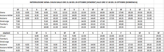 FIRENZE – Dalle 21,30 di venerdì 19 ottobre fino alle ore 17.30 di domenica 21 ottobre la linea ferroviaria Siena-Chiusi sarà interrotta per lavori di sostituzione di una travata metallica. Per garantire i collegamenti sarà attivato un servizio sostitutivo realizzato tramite bus con i seguenti orari.