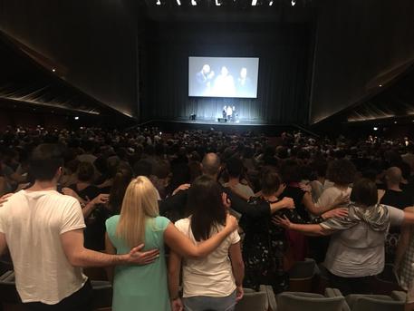 FIRENZE – In piedi per tre minuti, con una mano sulla spalla del vicino di poltrona e gli occhi chiusi per sentire l’energia: è la performance estemporanea che Marina Abramovic ha realizzato con i 1.500 spettatori di Marina Abramovic speaksFirenze: al Teatro del Maggio Musicale Fiorentino, incontro con l’artista intervistata da Arturo Galansino, direttore della Fondazione Palazzo Strozzi.