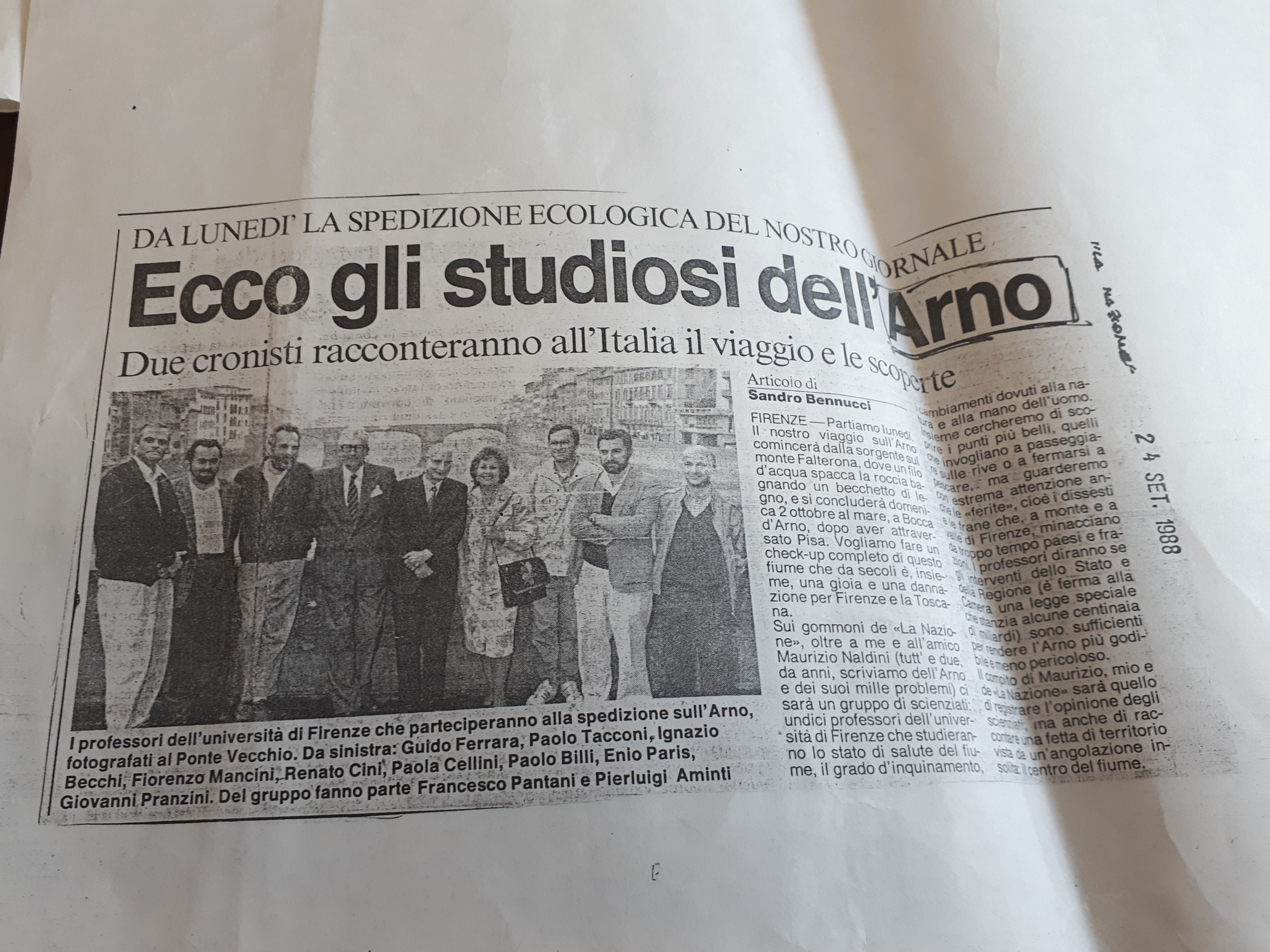Era il 26 settembre del 1988, trent’anni fa. Partimmo, con i gommoni e con le jeep, per andare a esplorare l’Arno: dalla sorgente sul Monte Falterona, dove c’è la lapide con i versi di Dante («Quel fiumicel, eccetera, eccetera») fino alla foce, a Marina di Pisa. Dove sbarcammo domenica 2 ottobre. Una spedizione organizzata da La Nazione e voluta da un grande direttore dell’epoca, Roberto Ciuni, per valutare lo stato di salute di un fiume che non è mai guarito. A bordo, per raccontare l’affascinante viaggio, due cronisti, il sottoscritto Sandro Bennucci e il collega Maurizio Naldini, con il fotografo Luca Moggi, autore di scatti forti come denunce. Con noi undici professori dell’Università di Firenze, ossia undici scienziati, profondi conoscitori del fiume nelle sue mile articolazioni, dalla biologia alla chimica, dalla geologia all’ingegneria idraulica: Guido Ferrara, Paolo Tacconi, Ignazio Becchi, Fiorenzo Mancini, Renato Cini, Paola Cellini, Paolo Billi, Enio Paris, Giovanni Pranzini, Francesco Pantani, Pierluigi Aminti. In cabina di regìa, come coordinatore dell’impegnativa comitiva, Francesco Carrassi, allora capo redattore e oggi (per la seconda volta) direttore del giornale.
