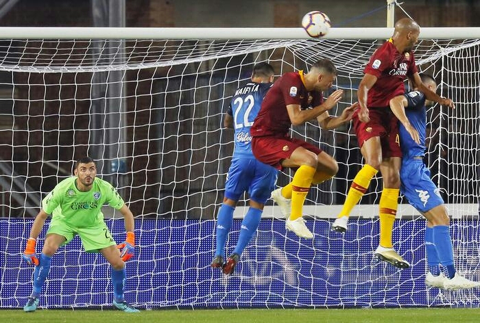 L’Empoli perde ancora: Roma tre vittorie di fila (0-2). Gol di Nzonzi e Dzeko. Caputo sbaglia rigore. Pagelle