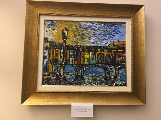 La presentazione delle opere, nel catalogo, è stata fatta da Emanuele Barletti, che ha citato soprattutto i deliziosi acquarelli eseguiti durante la sua permanenza a Cagliari, ma anche vedute con fiumi e l’immagine di Ponte Vecchio, testimonianza dell’ultima tappa della brillante carriera di Giuffrida. Il quale, presa la parola, ha confessato di prediligere una pittura espressa attraverso vivaci tonalità di colore, mentre la figura umana è rappresentata sempre come lontana, sfumata e non è presente molto spesso nelle sue opere. Che ci mostrano la decisa, spesso abbagliante solarità dei luoghi, i gialli, gli arancioni riportati nelle tele con il loro vigore naturale, con la luce che prevale sempre sulle ombre.