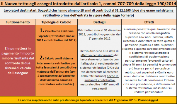L’impatto. In definitiva la misura impatta solo sui lavoratori che hanno almeno 18 anni di contribuzione al 31.12.1995 con contribuzione ulteriore versata dopo il 31 dicembre 2011 che, quindi per effetto della Riforma Fornero, vedono l’assegno determinato con il sistema retributivo sino al 31 dicembre 2011 e contributivo sulle anzianità contributive maturate dal 1° gennaio 2012. Ma il taglio concretamente coinvolge solo coloro che si sono trattenuti in servizio oltre l’età pensionabile di vecchiaia (cioè oltre i 66 anni e 7 mesi). Con il passaggio al contributivo questi lavoratori riescono infatti a valorizzare la terza quota di pensione (quota C) a ritmi superiori rispetto a quanto sarebbe accaduto con il sistema retributivo grazie a coefficienti di trasformazione piu’ alti perchè calcolati sino al 70° anno di età e alla mancanza del massimale pensionabile.