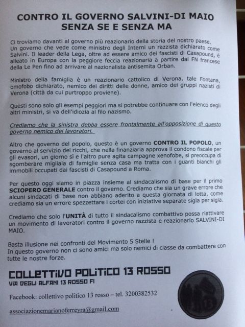 Nel manifesto diffuso dal Collettivo politico 13 rosso si legge: «siamo in piazza insieme al sindacalismo di base contro il governo. Questo non è un governo del popolo, ma un governo contro il popolo».