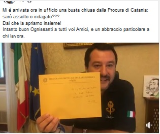 «Sicuramente c’è un po’ di sinistra che sta gufando, che dice condannatelo, all’ergastolo, non Battisti, ma Salvini in galera e sperava che dentro questa busta ci fosse una bella inchiestona.Ero sicuro di aver difeso l’interesse del mio paese e di non aver commesso nessun reato. Spero che sarà accolta la richiesta motivata di archiviazione del procuratore di Catania Zuccaro. Ma mi pongo la domanda: ma chi ha indagato, cosa ha indagato? Il Procuratore di Agrigento Patronaggio perché ha indagato? Quanto è costata questa inchiesta? Quante persone ha coinvolto? Quanti uomini delle forze dell’ordine sono stati allertati per un reato che non esisteva. C’è da fare una riflessione su come funziona la giustizia in Italia», aggiunge il ministro dell’Interno Matteo Salvini, in diretta Facebook.