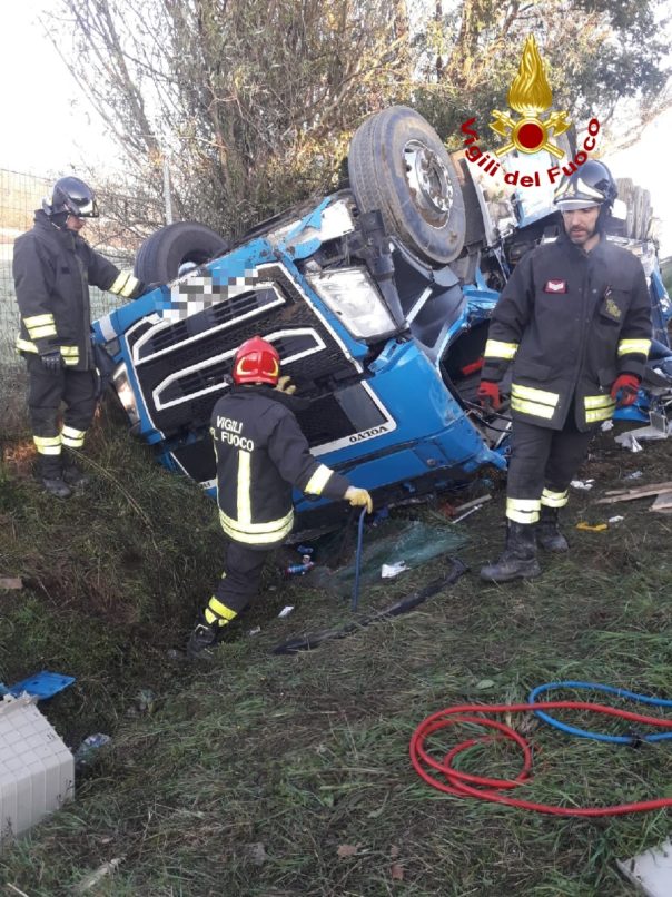 Siena: camion si ribalta, autista salvato dai vigili del fuoco con autogru