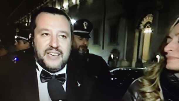 ROMA – Aveva incuriosito la notizia che Salvini avesse disertato la conferenza stampa di Caserta per un impegno ufficiale al Quirinale, una cena di stato con tanto di smoking. Abbigliamento del tutto estraneo e inusuale per il segretario leghista, abituato piuttosto alle felpe. eccolo nella foto mentre sfoggia un perfetto abbigliamento di gala, in smoking per partecipare al Quirinale alla cena di Stato organizzata in onore dell’emiro del Qatar. Intervistato in tivù ha però specificato: «Ma l’ho affittato». Al bavero, il vicepremier non ha dimenticato di sfoggiare il simbolo leghista.