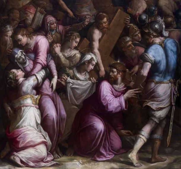FIRENZE – Nella Basilica di Santa Croce presentato oggi pomeriggio il restauro della pala d’altare di Giorgio Vasari. Il volto di Michelangelo nascosto sotto le sembianze di Nicodemo, che guarda in direzione della sua tomba, e quello di Rosso Fiorentino, con un copricapo vermiglio, nelle vesti di Giuseppe d’Arimatea sono riaffiorati dal restauro della tavola ad olio Andata al Calvario e incontro con Veronica, la pala d’altare che Giorgio Vasari eseguì nel 1572 su commissione di Cosimo I