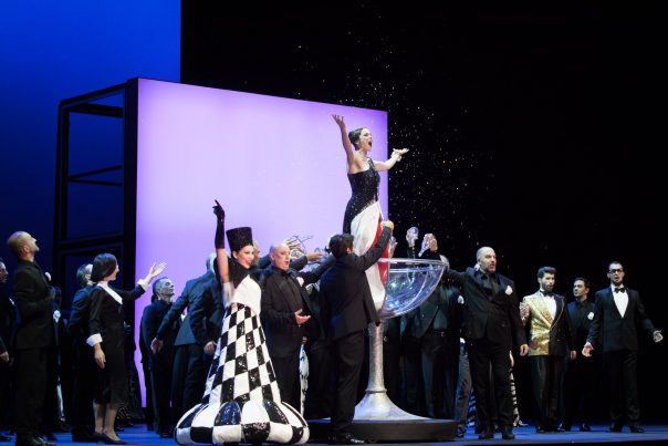 La regia è di Francesco Micheli, che ha voluto compiere, lo scorso settembre, l’esperimento di dare una lettura complessiva delle tre opere cronologicamente abbastanza vicine e accomunate da un successo planetario, anche se Verdi non le pensò come trittico. Come scenografia un monumentale impianto con la bandiera italiana a unire le tre opere e che poi si divide evidenziando il colore predominante della «Traviata», ovvero il bianco.
