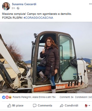 CASCINA (Pi) – «Missione compiuta! Campo rom sgomberato e demolito. Forza ruspa! #Coraggio Cascina». Così, su fb, Susanna Ceccardi, sindaco di Cascina (Pisa), dopo lo smantellamento stamani del campo rom nel comune del Pisano. «Ultime baracche del campo Rom di Navacchio demolite dalla #ruspa. Con la Lega finalmente arriva la Legalità!», le parole sempre di Ceccardi in un precedente post. Su fb la sindaca ha anche postato una foto nella quale è ritratta sopra una ruspa e col pollice alzato.