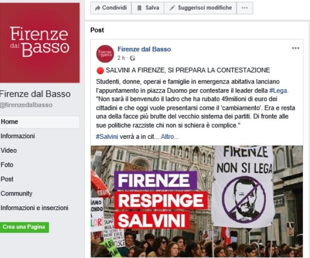 Questo il messaggio postata sul sito di Firenzedalbasso: «Studenti, donne, operai e famiglie in emergenza abitativa lanciano l’appuntamento in piazza Duomo per contestare il leader della #Lega. Non sarà il benvenuto il ladro che ha rubato 49milioni di euro dei cittadini e che oggi vuole presentarsi come il cambiamento. Era e resta una della facce più brutte del vecchio sistema dei partiti. Di fronte alle sue politiche razziste chi non si schiera è complice.»