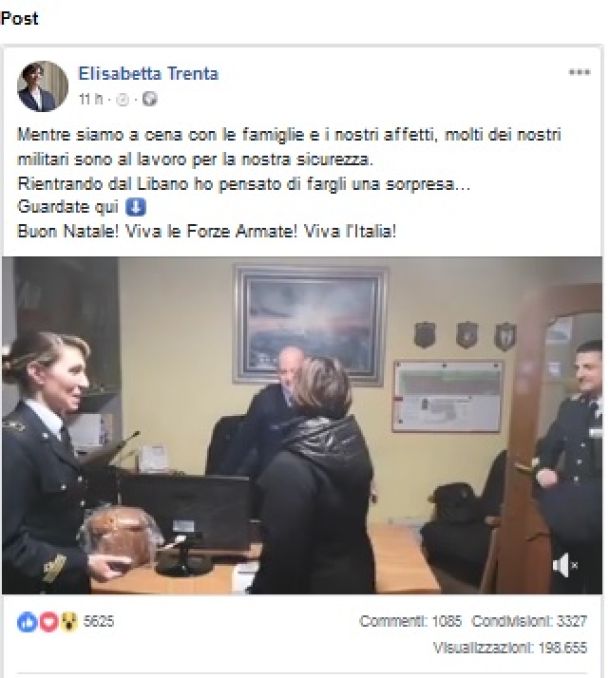 ROMA – «Mentre siamo a cena con le famiglie e i nostri affetti, molti dei nostri militari sono al lavoro per la nostra sicurezza. Rientrando dal Libano ho pensato di fargli una sorpresa… Buon Natale! Viva le Forze Armate! Viva