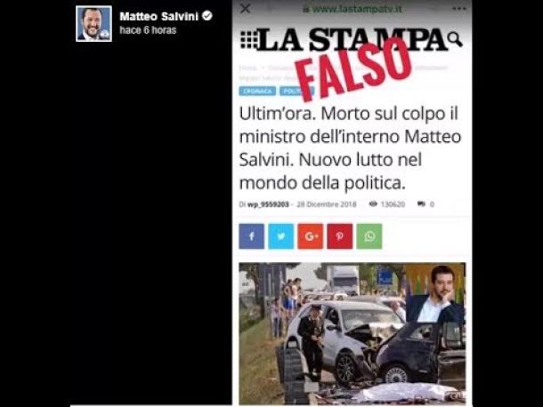 dalla direzione del quotidiano La Stampa a seguito di una fake news su Salvini diffusa falsificando la testata del quotidiano. Il vicepremier aveva già commentato con tweet la falsa notizia (che riportava la sua morte in un incidente stradale): «Adesso scherzano pure sulla mia morte, roba da matti! Mi allungano la vita, rispondo col sorriso».