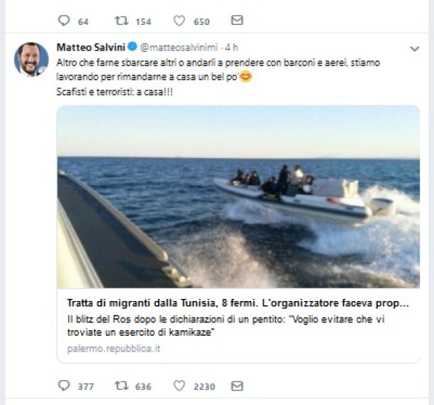ROMA – «Altro che farne sbarcare altri o andarli a prendere con barconi e aerei, stiamo lavorando per rimandarne a casa un bel po’. Scafisti e terroristi: a casa!». Lo scrive su twitter il ministro dell’Interno, Matteo Salvini, allegando un link alla notizia dell’operazione dei carabinieri del Ros, che hanno eseguito 15 fermi per favoreggiamento dell’immigrazione clandestina e istigazione al terrorismo. Esplicita la critica ai propositi manifestati dal premier Conte.