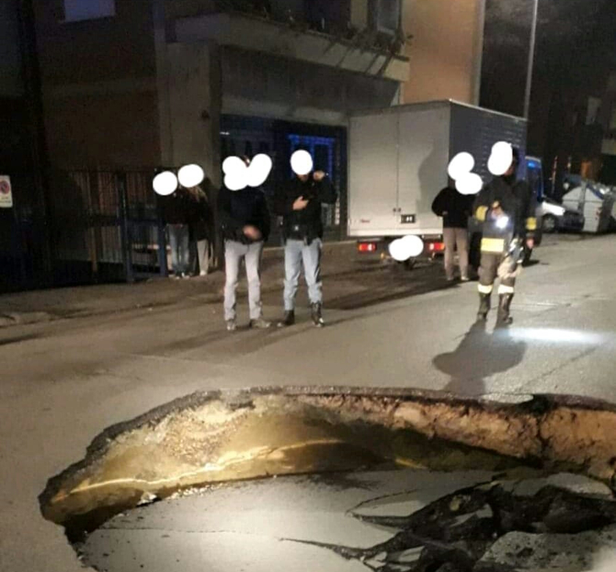 La voragine di via Viani, provocata dalla rottura di un tubo dell’acqua (Foto da Facebook)