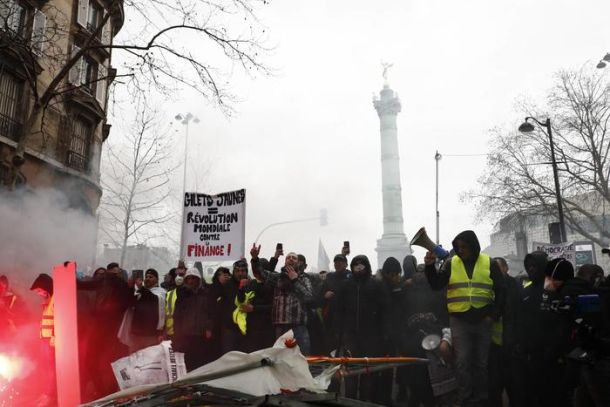Parigi: gilet gialli, violenti scontri alla bastiglia, con persone vestite di nero