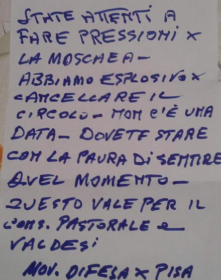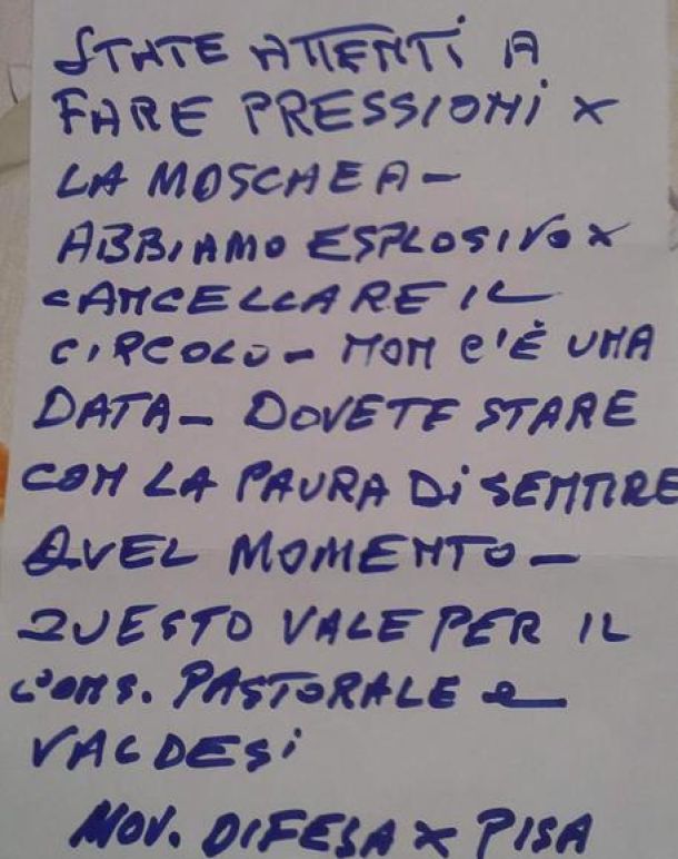 “Attenti a fare pressioni per la moschea – si legge nel biglietto siglato dal sedicente Movimento per la difesa di Pisa – Abbiamo esplosivo per cancellare il circolo. Non c”è una data. Dovete stare con la paura di sentire quel momento. Questo vale per il consiglio pastorale e per i valdesi”. Il riferimento finale è ai recenti appelli alla Giunta di centrodestra arrivati da parte della Chiesa cattolica e di quella valdese a rispettare la Costituzione e a consentire la realizzazione del luogo di culto per la comunità musulmana.