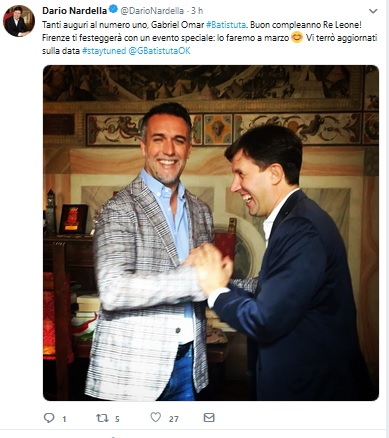 FIRENZE – Ai tanti appassionati di calcio che celebrano oggi i 50 anni di Gabriel Omar Batistuta si uniscono anche i politici fiorentini in primis il sindaco Nardella: «Tanti auguri al numero uno, Gabriel Omar Batistuta. Buon compleanno Re Leone!, Firenze ti festeggerà con un evento speciale: lo faremo a marzo. Vi terrò aggiornati sulla data» scrive Nardella su twitter, postando una foto con l’ex attaccante e ricordando l”evento ad hoc in programma per celebrare l’argentino.