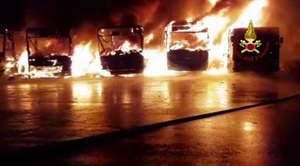 LAMPORECCHIO (PISTOIA) – Incendio in un deposito di autobus a Lamporecchio, in provincia di Pistoia. Squadre dei Vigili del fuoco di Pistoia e dei distaccamenti di Montecatini Terme, Pescia ed Empoli sono intervenuteo a Lamporecchio, in via Di Vittorio. Le fiamme hanno attaccato otto mezzi e le squadre di soccorso hanno spento il rogo, che ha danneggiato  gravemente i mezzi.