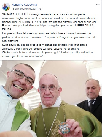Saliamo sui tetti! Papa Francesco non perde occasione, taglia corto con le esortazioni scontate. Si concede una foto che rilancia quell’Apriamo i porti, che sta unendo cittadini dal nord al sud del Paese e che per i cristiani è obbligo evangelico per essere liberi dalla paura, scrive don Capovilla su facebook postando il selfie con il papa e ricordando le parole pronunciate a Sacrofano dal pontefice: «La paura è l”origine di ogni schiavitù e di ogni dittatura. Sulla paura del popolo cresce la violenza dei dittatori».