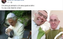 GENOVA – Ratzinger contro Bergoglio. Sta facendo discutere sui social la foto pubblicata su Facebook da Alberto Campanella, capogruppo di Fratelli d’Italia al comune di Genova che ha voluto contrapporre Papa e Papa Emerito in una disputa fra animali e migranti. «Chi ama gli animali e chi ama qualcos’altro: TU DA CHE PARTE STAI?», si legge infatti nel post al quale Campanella ha allegato un collage con l’immagine di Ratzinger che accarezza un gatto da un lato e, dall’altro, quella di Papa Francesco sorridente in compagnia, accompagnato da una piccola scritta in basso a destra che recita apriamo i porti. Molte le critiche arrivate al capogruppo FdI dopo il post, ormai virale sui social: “Più che una domanda, un’inaccettabile provocazione”, “Ma che razza di domanda è???”, “Fatti aiutare da uno bravo. Ne hai davvero bisogno”, alcuni dei commenti che è ancora possibile leggere sotto al post.