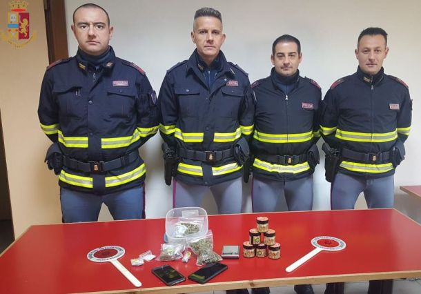 AREZZO – La Polizia Stradale di Arezzo ha arrestato due giovani per spaccio di stupefacenti. E’ accaduto sull’A/1, quando una pattuglia ha notato e fermato una Polo all’altezza di Valdichiana, diretta verso nord. I poliziotti hanno avuto il sospetto che i due, originari di Arezzo, 21enni, stessero nascondendo qualcosa. Li hanno perquisiti e sul sedile posteriore del mezzo, coperta da un giaccone, è stata rinvenuta una busta di cellophane contenente 6 barattoli e 2 grammi di marijuana californiana, dalla cui vendita è possibile ricavare anche 100 euro, data la sua particolare purezza.