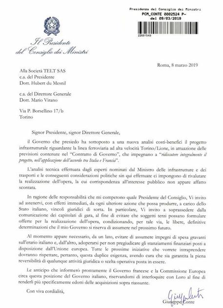 Il premier ha pubblicato il carteggio con Telt e ha aggiunto: «la società Telt mi ha appena risposto confermandomi che i capitolati di gara non partiranno senza l’avallo del mio governo e del governo francese e che, al momento, si limiteranno esclusivamente a svolgere mere attività preliminari, senza alcun impegno per il nostro Stato. Ho chiarito che questo Governo e le forze politiche che lo sostengono si sono impegnati a ridiscutere integralmente questo progetto e che abbiamo intenzione di interloquire con la Francia e con l’Unione europea alla luce delle più recenti analisi costi-benefici da noi acquisite. Ovviamente non vogliamo che nel frattempo si perdano i finanziamenti europei già stanziati».