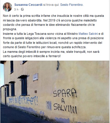 FIRENZE – Una scritta che incita a sparare al vicepremier e ministro dell’Interno Matteo Salvini è stata lasciata a Sesto Fiorentino (Firenze). Ne dà notizia la coordinatrice della Lega in Toscana Susanna Ceccardi che posta su facebook una foto della scritta: Spara a Salvini. «Non è certo la prima scritta infame che insudicia le nostre città – commenta Ceccardi – ma questa mi lascia davvero sbalordita. Nel 2019 c’è ancora qualche maledetto codardo che pensa di fermare le idee eliminando fisicamente chi le propugna. Insieme a tutta la Lega Toscana sono vicina al Ministro Matteo Salvini e di fronte a queste istigazioni alla violenza mi aspetto una presa di posizione forte da parte di tutte le istituzioni locali, nonché un rapido intervento del comune di Sesto Fiorentino per rimuovere questa schifezza. La mamma degli imbecilli è sempre incinta – conclude Ceccardi – ma, state tranquilli, non sarà certo qualche povero imbecille a fermarci».