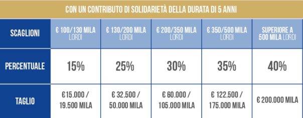 Andrà molto peggio ai cosiddetti pensionati d’oro. Sempre in base alla legge di bilancio 2019 chi ha una pensione netta mensile pari o superiore ai 5mila euro al mese, subirà un contributo di solidarietà della durata quinquennale. il contributo si articola su cinque fasce: