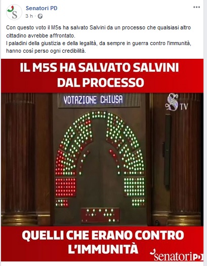 Sopra la fotografia che fissa il momento in cui sul tabellone elettronico di palazzo Madama appaiono i voti dei senatori, con un amplissimo arco di lucine verdi che va dalla destra, passa per Fi e Lega e comprende anche i pentastellati, si legge il titolo: Il M5S hasalvato Salvini dal processo e poi, in basso, Quelli che erano contro l’immunità. Nel post si legge che “con questo voto il M5S ha salvato Salvini da un processo che qualsiasi altro cittadino avrebbe affrontato. I paladini della giustizia e della legalità, da sempre in guerra contro l’immunità, hanno così perso ogni credibilità.