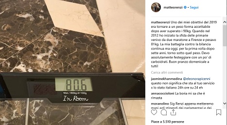 Renzi festeggia, ha perso 10 Kg. Foto della bilancia su Instagram