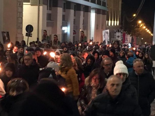 Un’onda di luce disegnata dalle fiaccole per le vie dell’Aquila nella notte del decennale del sisma che alle ore 3 e 32 del 6 aprile del 2009 distrusse la città e il suo circondario causando la morte di 309 persone. In corteo non solo i familiari delle vittime del sisma. Con loro anche le persone colpite da altri disastri, da Amatrice a Rigopiano, dall’Emilia a Viareggio, a San Giuliano di Puglia. Un decennale che ha riacceso i riflettori sulla città, presa d’assalto per l’anniversario dai media nazionali e internazionali. Come ogni anno da dieci anni il silenzio si rompe solo dal rumore dei passi del lungo serpentone umano. Ad aprirlo lo striscione dei familiari delle vittime con la scritta Per noi, per loro e per tutti’ e con un lenzuolo con i nomi dei 309 morti del sisma.