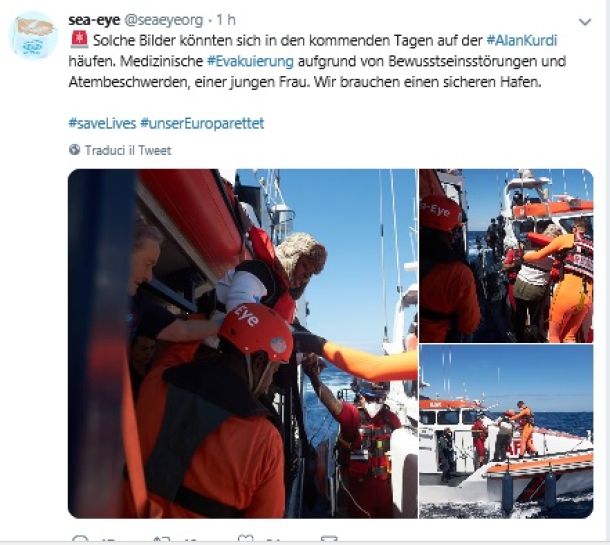 conoscenza, è stata evacuata dalla Alan Kurdi, la nave di Sea Eye che da tre giorni si trova al largo di Malta dopo il rifiuto dell’Italia e delle stesse autorità di La Valletta di assegnare un porto sicuro per sbarcare i 64 migranti soccorsi al largo della Libia una settimana fa. La ong tedesca ha postato su twitter alcune foto della donna che sale a bordo di una motovedetta della Guardia Costiera maltese. «Queste immagini potrebbero ripetersi nei prossimi giorni scrive Sea Eye rinnovando l’appello alle autorità: la permanenza a bordo mette in seria difficoltà la salute delle persone soccorse, hanno bisogno di sbarcare il prima possibile».