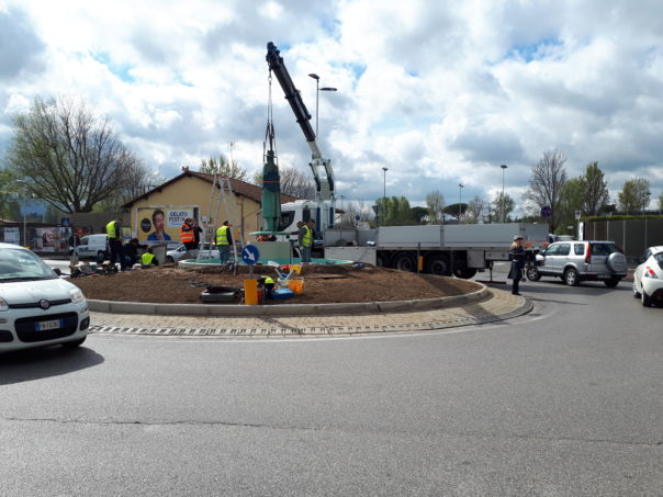 Firenze: l’omino di Folon è tornato al suo posto nella rotonda di Tuscanyhall. Con il paraurti