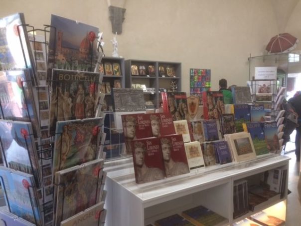La gestione del nuovissimo bookshop è affidata alla storica ditta Ceruti di Firenze, paramenti e arredi sacri , che ha sviluppato collaborazioni con ditte selezionate e sviluppato quindi un’offerta molto articolata (icone, argenti, cuoio, incensi, statuaria e altro) di certificata qualità artigianale. Nel bookshop ovviamente si trovano pubblicazioni e libri sulla basilica di San Lorenzo e sul complesso mediceo-laurenziano.