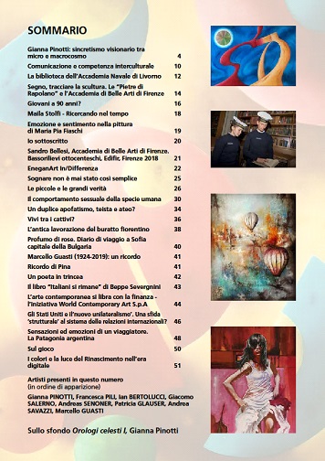 FIRENZE – Eclettiche come sempre nella loro profondità le nuove idee che compaiono su questo numero, descritte da firme prestigiose o nuove. Uno studio approfondito sulla comunicazione e competenza interculturale è seguito dalla cultura che emana la biblioteca dell’Accademia Navale di Livorno. Uno sguardo al testamento dei più famosi uomini del passato lasciato al notaio prima di spirare, la domanda “si può essere giovani a 90 anni?” a cui danno risposta i nostri collaboratori, nuove riflessioni sul comportamento sessuale della specie umana, stupiscono la sensibilità del lettore e ne stimolano la creatività mentre atei e teisti compaiono come due facce della stessa medaglia. Arte contemporanea e finanza: è possibile separarle? E ancora: cosa separa il gioco dal comportamento? Quanto il sistema delle relazioni internazionali viene intaccato dal “nuovo unilateralismo” degli USA? Italiani e tedeschi: differenze e identità. Viaggi in Bulgaria e in Patagonia.