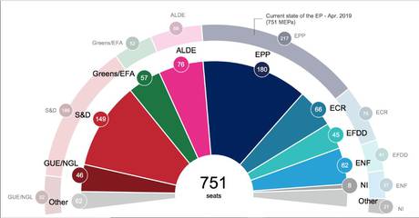 Secondo le proiezioni, i popolari uniti ai sovranisti, conservatori ed estreme destre non avrebbero la maggioranza assoluta al prossimo Parlamento europeo. Sommando insieme gli eurodeputati dei Popolari (180) insieme all’Ecr (66), l’Efdd (45), e l’Enf (62) si arriva a 353 su un totale di 751 seggi. Una possibile maggioranza potrebbe esserci invece sommando ai Popolari i seggi degli S&D (149), Liberali (76) per un totale di 405. Se uniti insieme a Macron la maggioranza sarebbe più ampia, pari a 426 seggi.