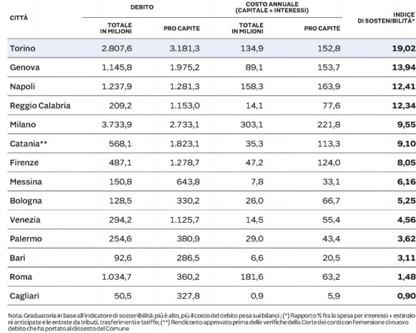Ebbene, la graduatoria del rischio è guidata da Torino, con un indice del 19,02%, seguita da Genova (13,94%), Napoli (12,41%), Reggio Calabria (12,34%) e via via tutte le altre dieci, con Cagliari la più tranquilla (0,90%) preceduta da Roma (1,48%). Ma quest’ultimo caso è solo un’illusione ottica, perché l’indice è calcolato su 1,034 miliardi di debito nuovo, senza contare i 12 del pregresso in capo al Commissario. Firenze si situa a metà classifica, al 7° posto su 14, con indice pari a 8,05, un totale del debito pari a 487,1 milioni, un costo annuale (capitale + interessi) di 47,2 milioni.