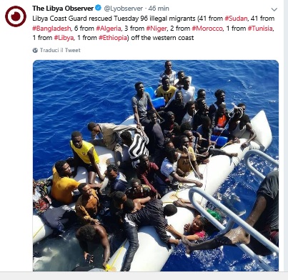 Lo scrive su Twitter il ”Libya Observer” postando una foto in cui si vede un gommone semi affondato e diversi migranti in acqua. A bordo dell’imbarcazione, secondo il giornale, c’erano 41 sudanesi, 41 bengalesi, 6 algerini, 3 nigeriani, 2 marocchini,un tunisino, un libico e un etiope.