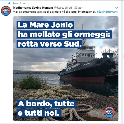 LAMPEDUSA – Dopo la querela presentata dal suo armatore contro il Viminale e Salvini, che nella direttiva ad navem avrebbero diffamato la Nave Mare Jonio, terminata la sosta forzata la nave della Ong nemica giurata di Salvini ha ripreso il mare, dirigendosi verso le coste libiche. Lo annuncia orgogliosamente la stessa Ong Mediterranea sul suo profilo twitter: «Mai ci sottrarremo alle leggi del mare né alle leggi internazionali. La Mare Jonio ha mollato gli ormeggi: rotta verso Sud. A bordo, tutte e tutti noi.»
