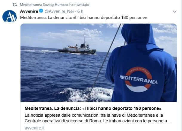operazione di cattura e deportazione verso porti libici di due imbarcazioni rispettivamente con circa ottanta e cento persone a bordo, che stavano proprio cercando di fuggire da quel contesto di violenza e guerra per cercare rifugio in Europa». Così, Mediterranea Saving Humans.