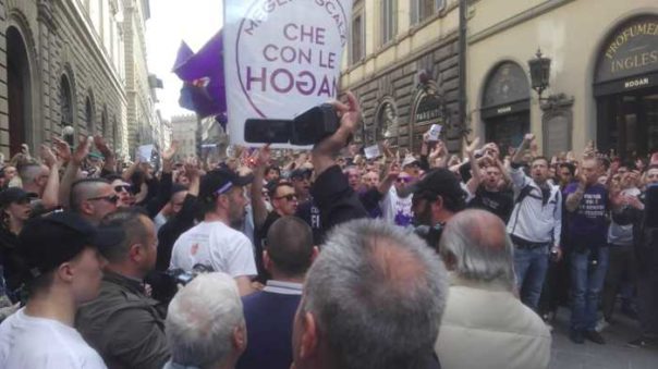 FIRENZE – Puntuale, intorno alle 16 di oggi, 11 maggio, è scattata la protesta dei tifosi della Fiorentina in via Tornabuoni, ossia nel cuore di Firenze, contro la famiglia Della Valle, proprietaria della Fiorentina. Una protesta composta, durata poco più di un quarto d’ora. Protesta però diventata più convinta, se possibile, dopo la lettera aperta di Diego Della Valle dalle colonne de La Nazione. Lettera considerata una nuova sfida, invece che un tentativo di conciliazione verso una città, e soprattutto una tifoseria del tutto scontenta non solo del comportamento della squadra, ma anche della conduzione della società.