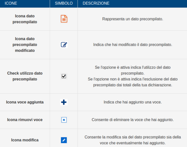 In tutti i casi, il salvataggio dei dati inseriti comporta automaticamente il ricalcolo delle detrazioni. Nella tabella sottostante sono indicate le diverse icone che identificano le voci di spesa precompilate e le eventuali operazioni effettuate.