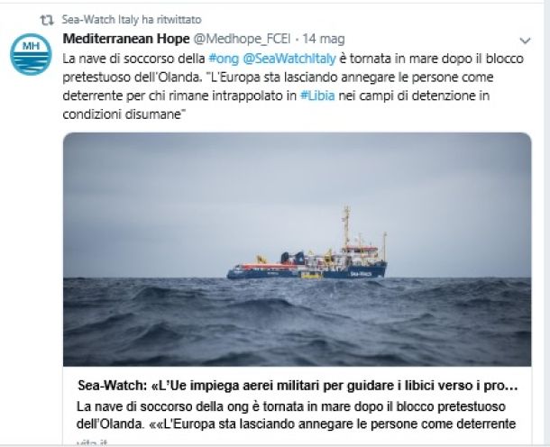 «SeaWatch ha soccorso 65 persone da un gommone a 30 miglia (60 km circa) dalle coste libiche, avvistato da un aereo civile di ricognizione. Libia, Malta, Italia, Olanda sono state informate: nessuna risposta. Nel Mediterraneo stanno diminuendo i testimoni, non le partenze». Lo scrive in un tweet la stessa organizzazione tedesca no profit.