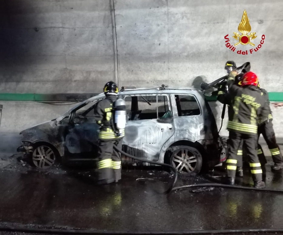 L’auto in fiamme in autostrada, con l’intervento dei vigili del fuoco