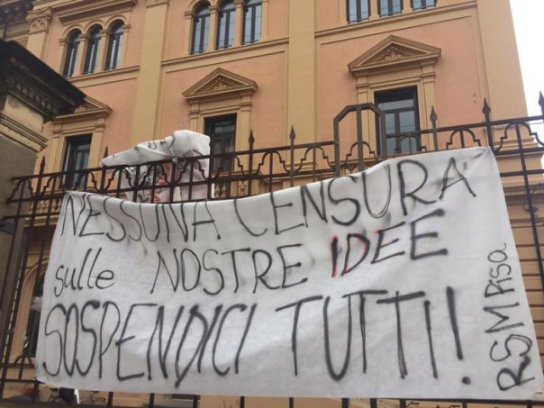 Su cancellate di scuole invece l’organizzazione studentesca Rete degli studenti medi ha esposto striscioni con la scritta: «Nessuna censura sulle nostre idee: sospendici tutti». Gli striscioni hanno campeggiato alcuni minuti durante l’orario di ingresso degli studenti prima di essere rimossi in ossequio alla normativa che vieta l’esposizione di cartelli politici sulle cancellate degli istituti scolastici.