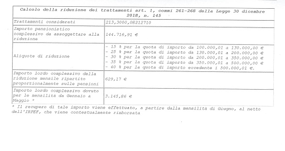 Ancora più elevati, addirittura una falcidia, i tagli per le pensioni alte, previsti per cinque anni, in proporzione all’assegno percepito. Con il Messaggio numero 1926 del 20-05-2019 l’Inps spiega come sono stati effettuati i tagli alle pensioni d’oro, con effetti dalla mensilità di pensione di giugno 2019, previsti dall’art. 1, commi da 261 a 268, della legge n. 145/2018 (Legge di Stabilità 2019). Nel cedolino di giugno, a parziale consolazione dei pensionati d’oro taglieggiati, l’Istituto graziosamente elenca in dettaglio come viene calcolata la riduzione:(vedi sotto un esempio), che comporta, nel caso di specie, una riduzione mensile di quasi 2.000 euro: