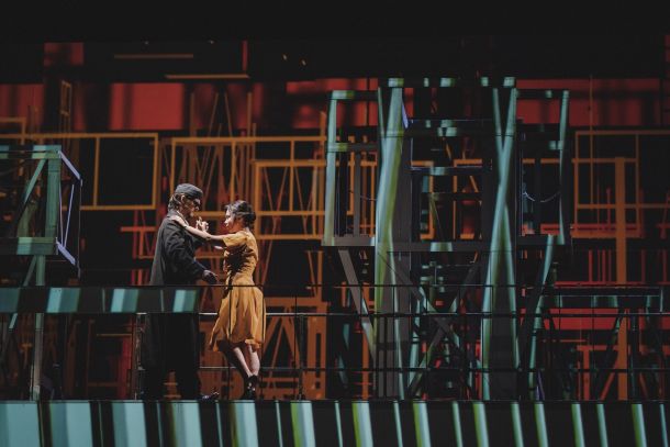 L’allestimento vede protagonista una città scheletrica, agitata da luci e immagini, sovraccarica di segni lasciati da epoche diverse. Una città senza tempo abitata da una folla disorientata, quasi immobile come instupidita, che ingloba i quattro interpreti, volutamente non definiti personaggi.